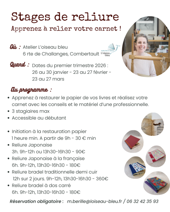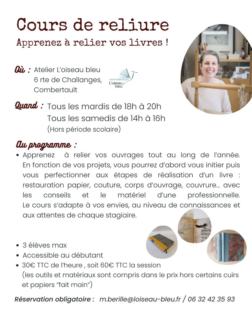 Ces cours se déroulent les mardis de 18h à 20h et les samedis de 14h à 16h. Ils s'adressent à toute personne désireuse de se perfectionner en reliure. Trois places disponible.